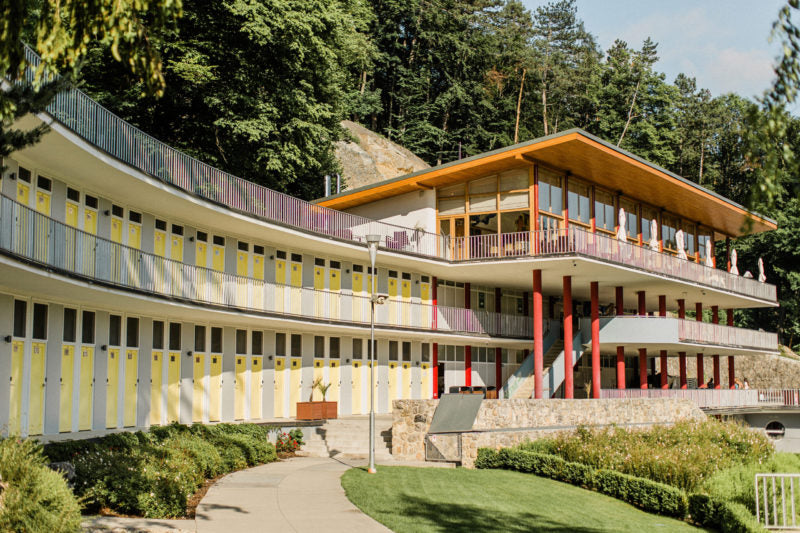 Teplice, built in the functionalist style, is unique not only for its inter-war architecture but also for its history, which dates back to the second half of the 1930s. After the First World War, the area had been used as a location for the recuperation of wounded soldiers and it was at that time that the decision was taken to build a swimming pool in the woods. The building, standing on a hill above the spa town surrounded by mountains, is the work of the Brno architect Bohuslav Fuchs.