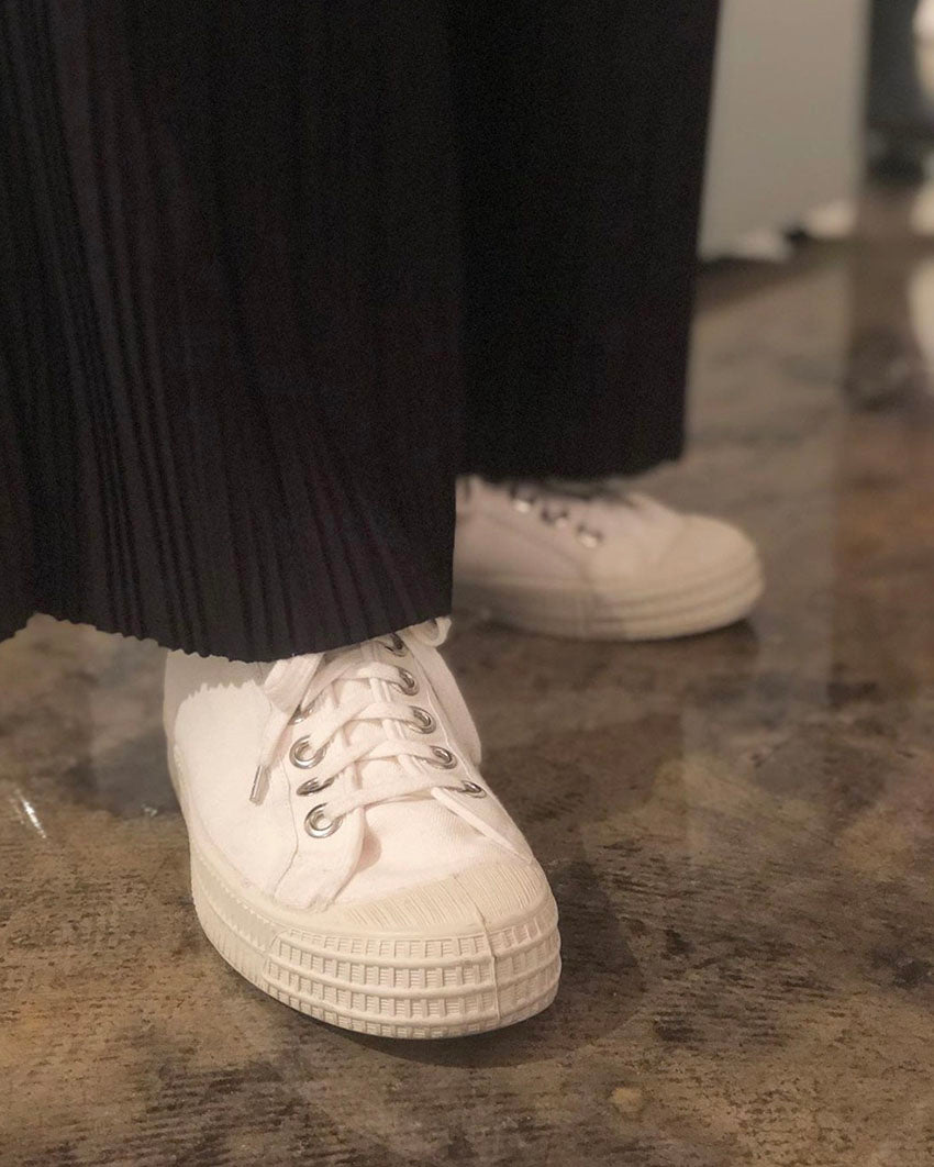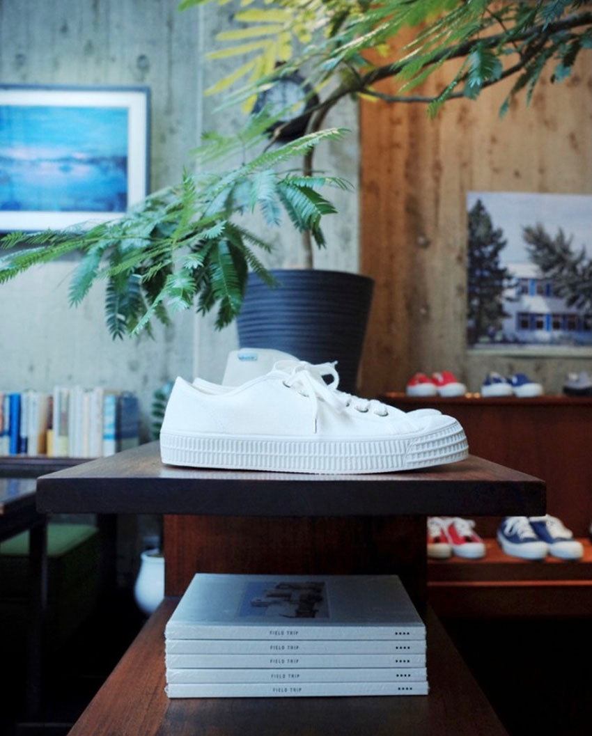 NOVESTAの代表モデル。工場の創業当初から残っているミリタリー/ワーク用途で使われていた型をベースとした定番のスニーカー。耐久性に優れたバルカナイズド製法で作られています。素材は天然ゴムのソールに綿キャンバス。素朴な味わい。中敷きを外して洗うこともできます。